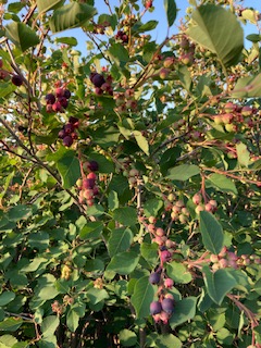 Today as Mike and I were weeding along a row of saskatoons, we were pleasantly surprised to see several that were ready to pick. It’s still too early to be able to pick clusters, but for the eager saskatoon-lover who wants an early start on their 2021 season, we’ll be open every day starting July 17, from 9am to 6pm.