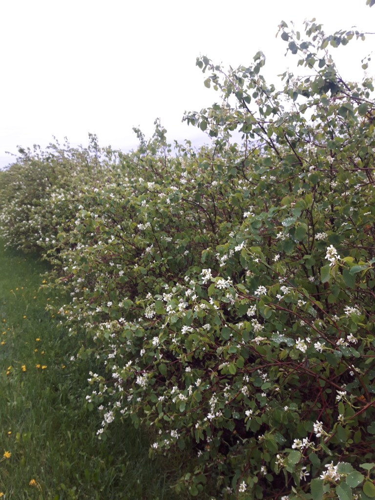 Showing pictures of the saskatoon blossoms is a yearly tradition, but the dates have varied quite a bit from year to year. I think May 11 was the earliest appearance, and although I may be wrong, it seems like this is the latest…June 6, and the blossoms have just appeared. Such a happy sight!