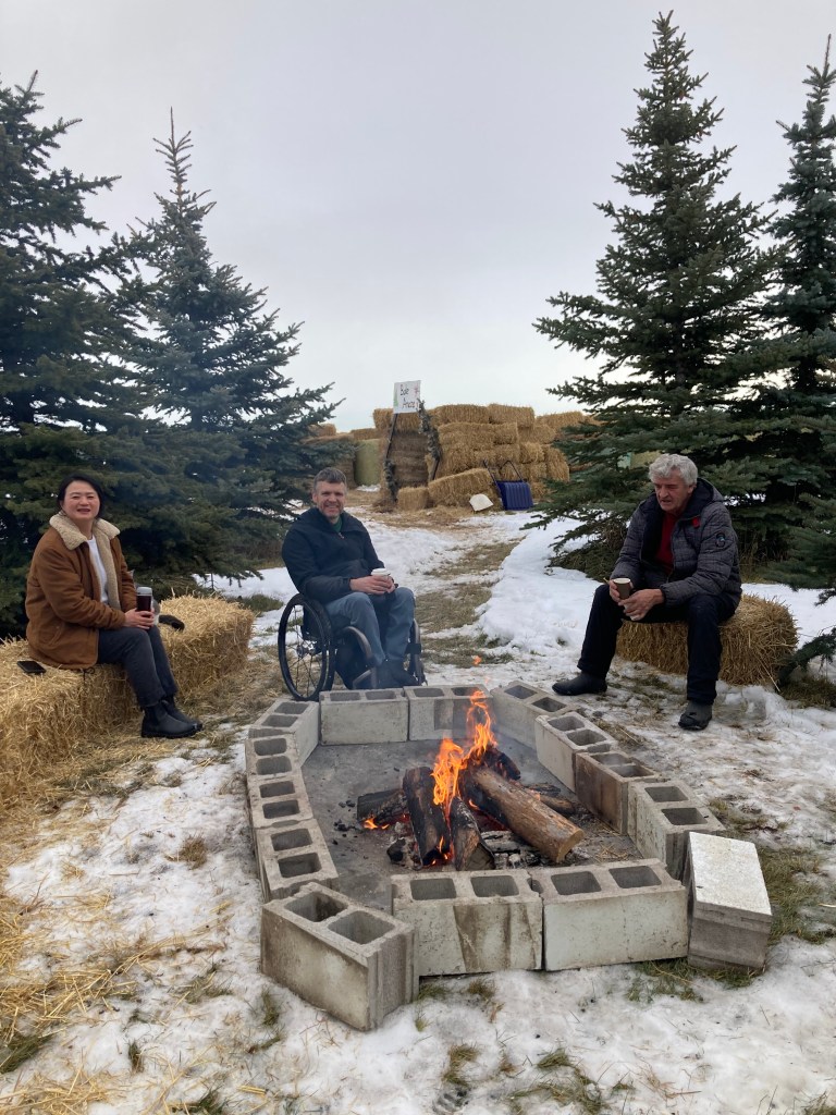Going through the bale maze has been a lot of fun, and you can warm up by the fire here beside the maze or by the store where the Christmas trees are standing. Have a hot beverage and a saskatoon/white chocolate scone while you choose the perfect tree for your home this year. We’re open Saturdays and Sundays from 10am to 5pm until Christmas.